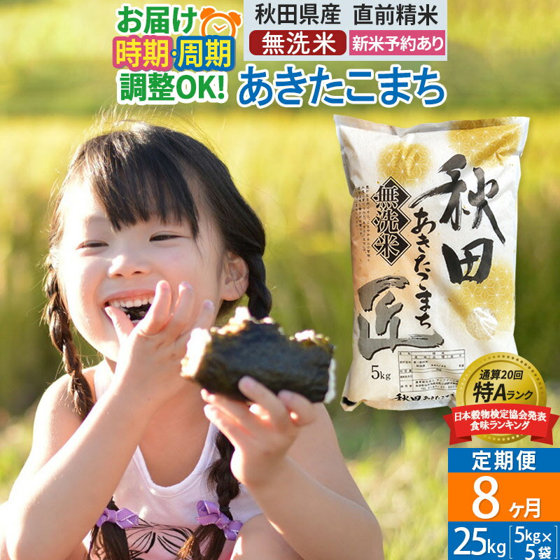【ふるさと納税】【無洗米】《定期便8ヶ月》秋田県産 あきたこまち 25kg (5kg×5袋) ×8回 計200kg 令和3年産 時期選べる新米 令和4年 一等米 8か月 8ヵ月 8カ月 8ケ月 25キロ お米 新米予約