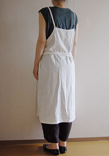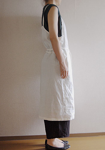 ◆表地 ●リネンコットンキャンバス(布帛) ●カラー ・オフホワイト ◆フロントスタイル ◆サイドスタイル ◆バックスタイル ◆前身頃 ◆トリミングを延長した肩ヒモ ◆カシュクールデザイン ◆後身頃 ◆左側のみ脇ポケット