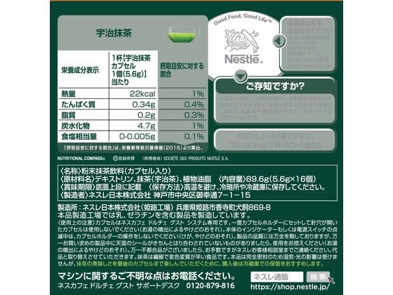 【検索用キーワード】ねすれ NESTLE ネスカフェ NESCAFE DOLCEGUSTO どるちぇぐすと ウジマッチャ うじまっちゃ UJIMATCHA 5.6g 5.6グラム カプセルタイプ 箱入り 箱売り 1箱 16個入り インスタント飲料 インスタントコーヒー 珈琲 coffee 紅茶 ココア ミックス 各種インスタント飲料 nes_cap