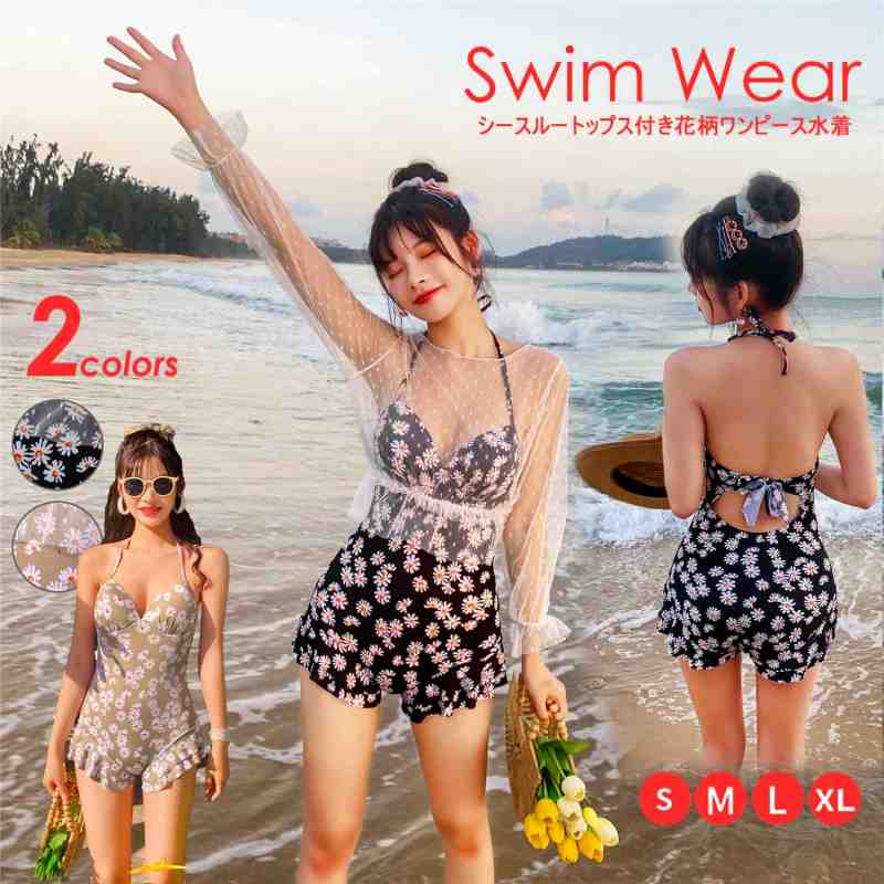 レディース ワンピース水着 シアー シースルートップス フリルパンツ 花柄 体型カバー 映え【大きいサイズ レディース 体型カバー フィットネス ワンピース ショートパンツ タンキニ ビキニ mizugi】