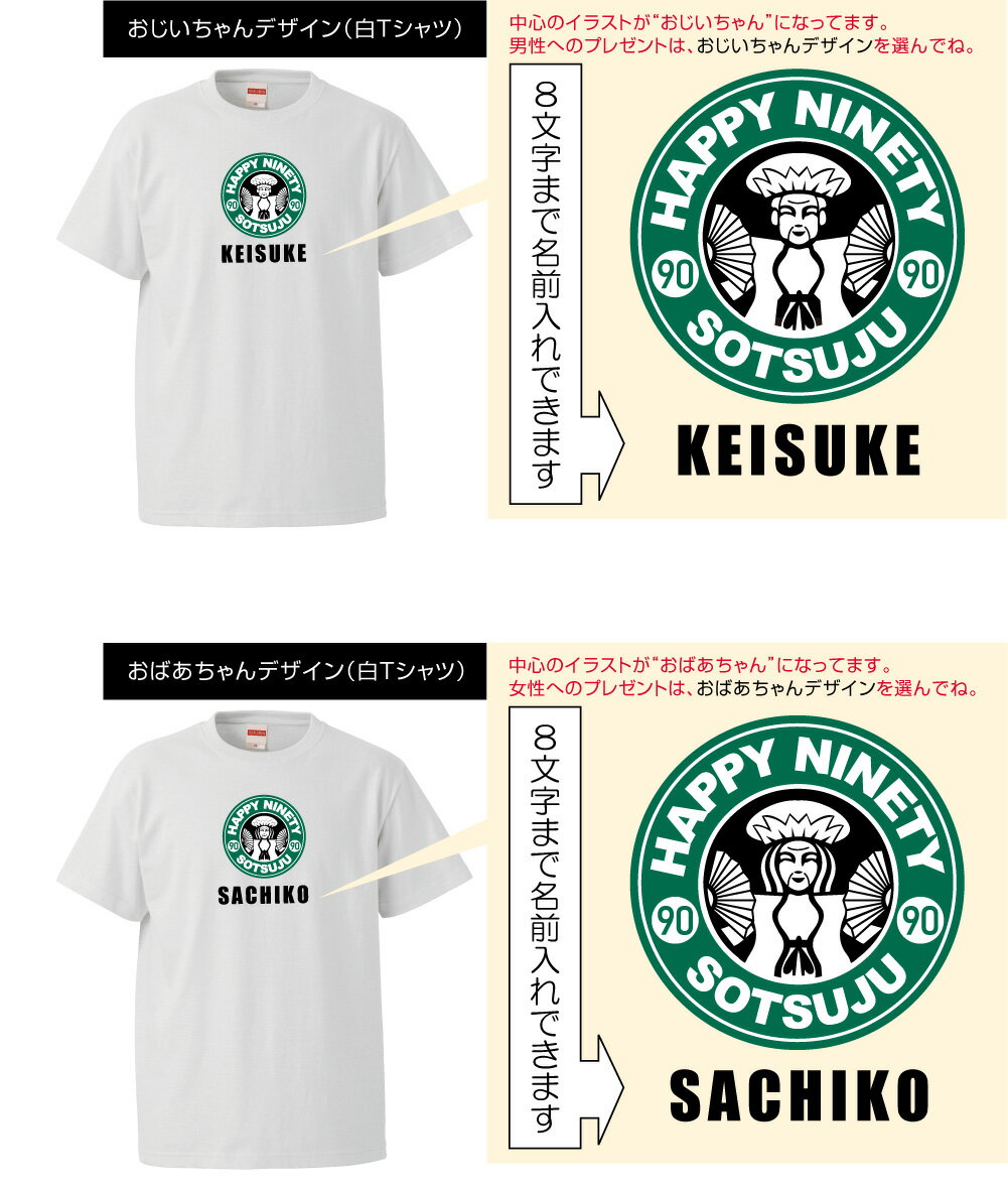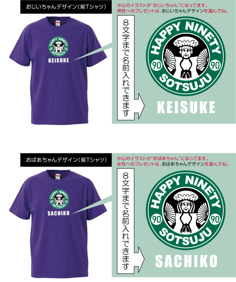 男性にはおじいちゃんデザインを、女性にはおばあちゃんデザインを選んでくださいね! さらにTシャツのカラーも紫と白から選べます。