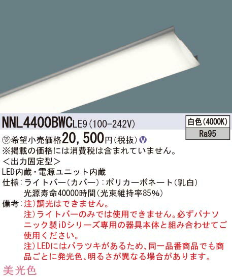 NNL4400BWCLE9 パナソニック の返品・交換について NNL4400BWCLE9 商品の仕様 メーカー / 型番: NNL4400BWCLE9 パナソニック ライトバー 40形商品カテゴリ: 照明器具 施設用照明器具 ベースライト LED 通販注意事項: ※単体使用不可ランプ色: LED(白色)ランプ・W数: LED内蔵取付方法: 取付・電気工事が必要です。