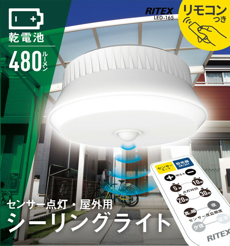 LED シーリングライト RITEX ライテックス リモコン付き ムサシ 乾電池式 屋外用 センサー 8.5W 480ルーメン カーポート(代引不可)【送料無料】