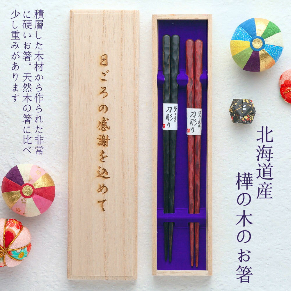長さ 黒23cm・赤23cm 素材 樺の木科(真樺)・ポリエステルウレタン 箸先 丸・滑り止めなし 製造国 日本 付属品 二膳用桐箱 名入れ レーザー彫刻機にて彫り込み、金色の塗料を埋め込みます。