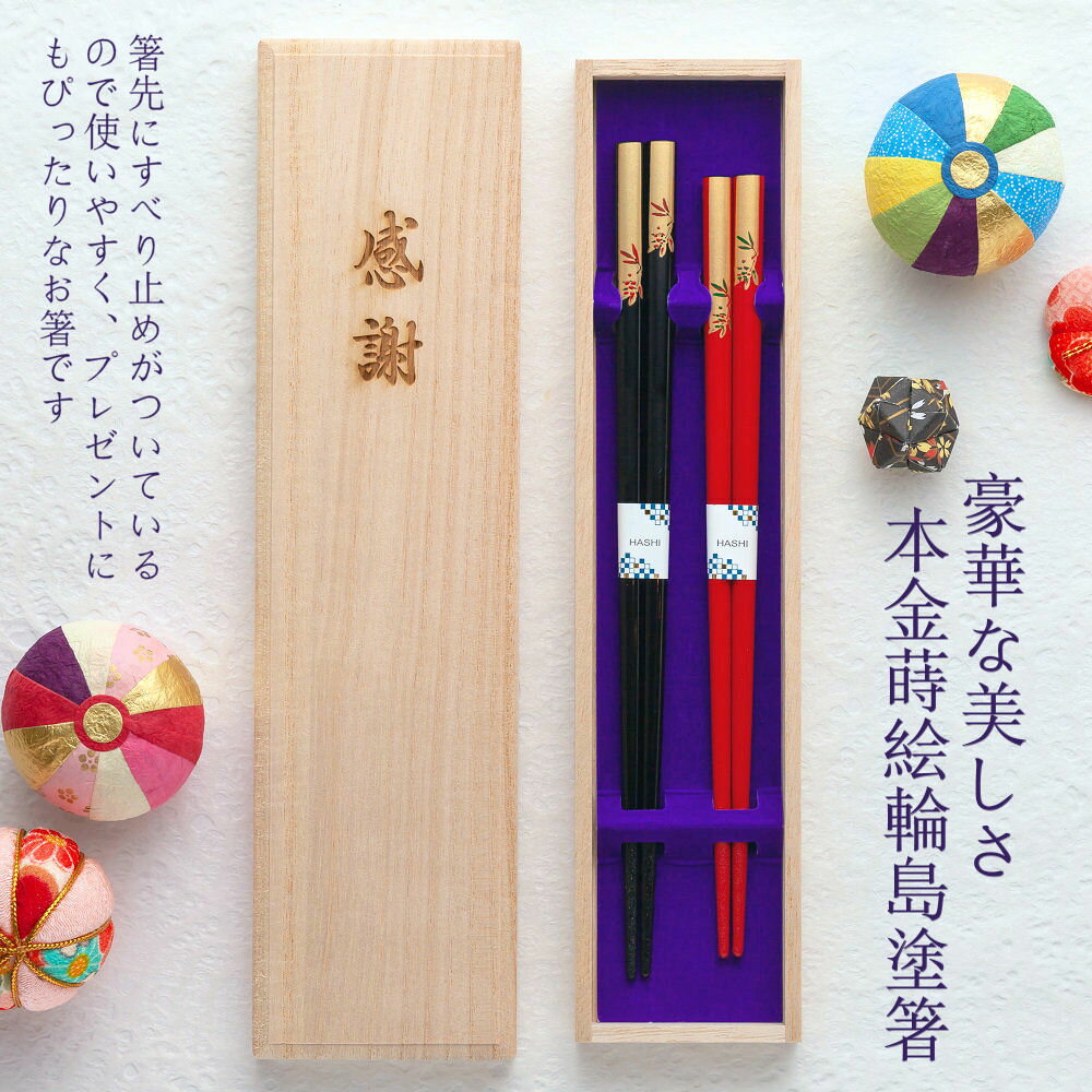 長さ 黒22.5cm・赤21cm 素材 天然木・漆 箸先 丸・滑り止め付き 製造国 日本 付属品 二膳用桐箱 名入れ レーザー彫刻機にて彫り込み、金色の塗料を埋め込みます。
