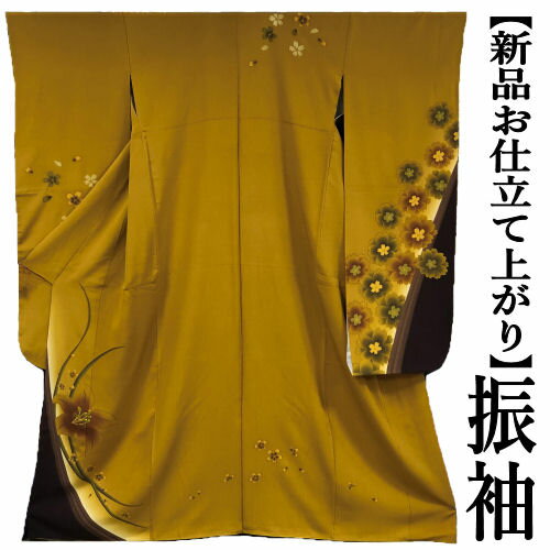 【送料無料】 本振袖 お仕立て上がり 成人式 正絹 袷仕立て 京友禅 芥子色 山吹色 百合 桜 ちりめん生地 吉祥花模様 古典柄 振袖 仕立て上がり 新品 日本製 礼装 フォーマル おしゃれ 卒業式 袴 結婚式 披露宴 着物 和装 和服 たとう紙付き 単品